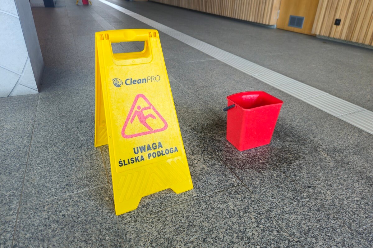 Aby zapobiec tworzeniu się zalewiska na posadzce, na miejscu ustawiono wiadra zbierające wodę oraz potykacze ostrzegające podróżnych przed śliską nawierzchnią.