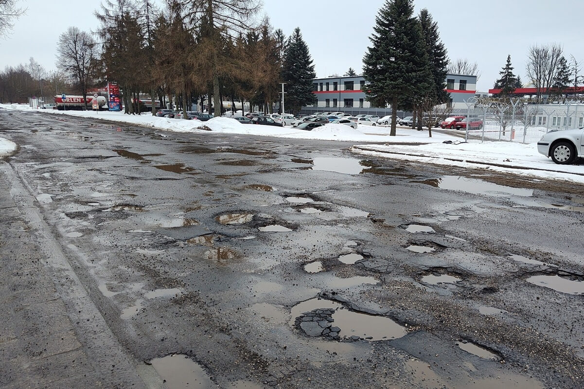 Według jego relacji ubytków w jezdni praktycznie nie da się ominąć, a kierowcy, którzy rzadko tamtędy jeżdżą i nie znają specyfiki tej drogi, często uszkadzają samochody lub przynajmniej z ogromnym hukiem wpadają w głębokie doły zamaskowane śniegiem lub kałużą.