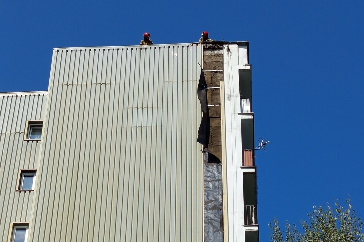 – Odpadła część elewacji metalowej blachy ze ściany na najwyższych piętrach. Na szczęście elementy metalowe nie uszkodziły postronnych osób ani samochodów – relacjonował nasz czytelnik Bartłomiej, świadek zdarzenia.