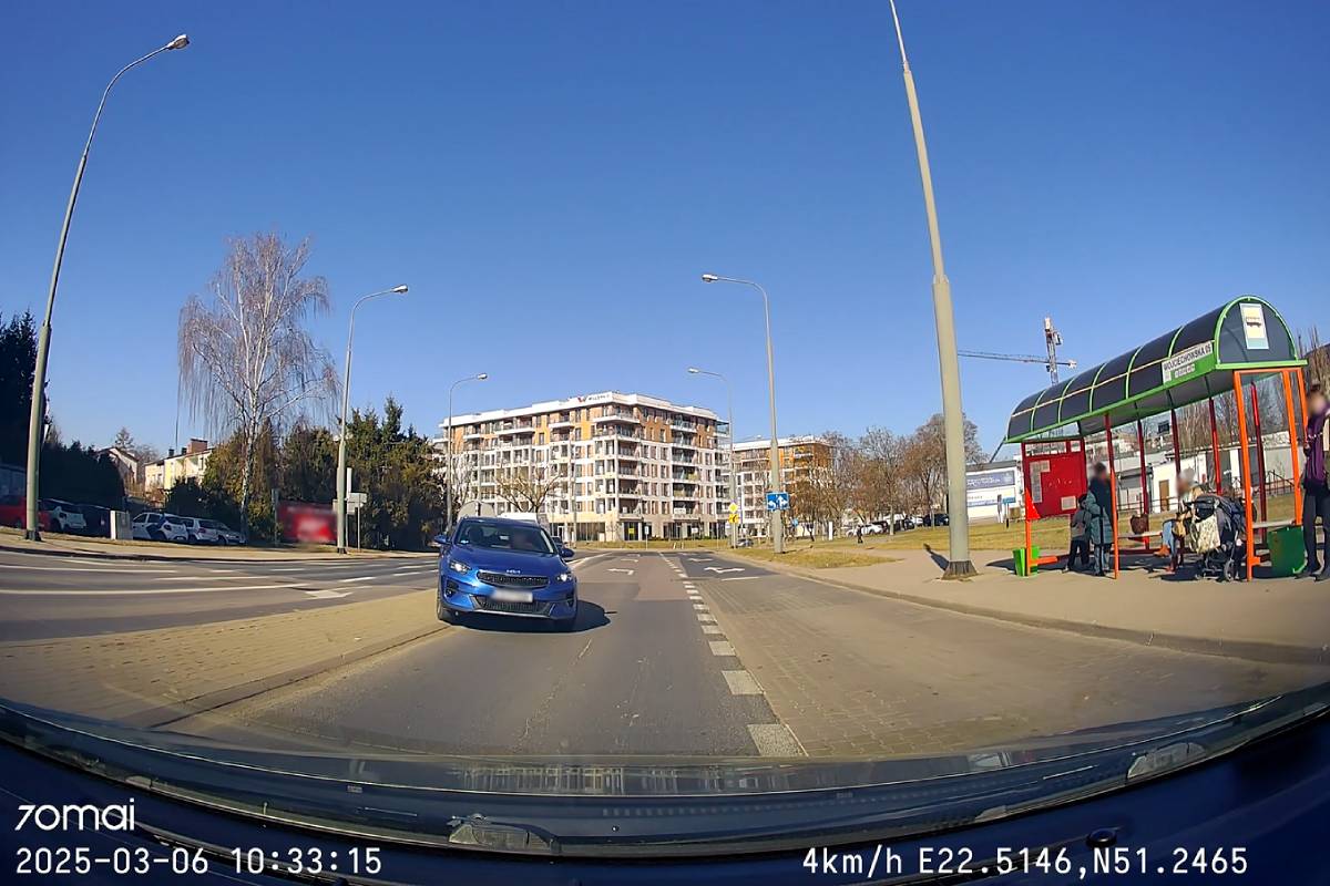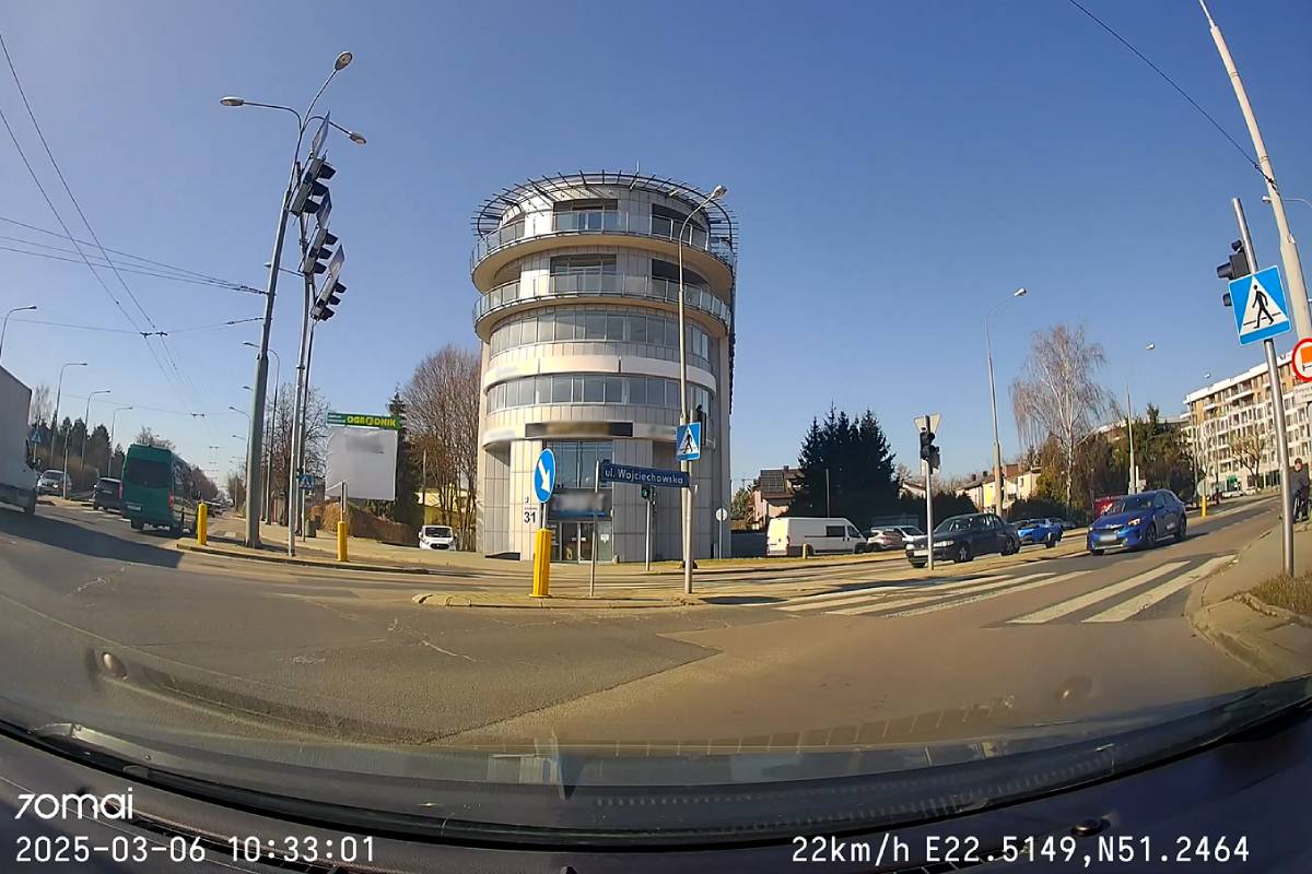 Świadkiem tej sytuacji był pan Adam, który zarejestrował ją kamerą samochodową. W chwili zdarzenia wykonywał manewr skrętu w prawo z al. Kraśnickiej w ul. Wojciechowską. To właśnie wtedy zauważył, że na jego pasie ruchu stoi przodem do niego samochód marki Kia. Zatrzymał się, czekając na reakcję kierowcy. Po chwili kierujący pojazdem zorientował się, że znajduje się na niewłaściwym pasie i próbował cofnąć, jednak, zamiast poprawnie wykonać manewr, uderzył w znak drogowy C-9 znajdujący się na wysepce między jezdniami.